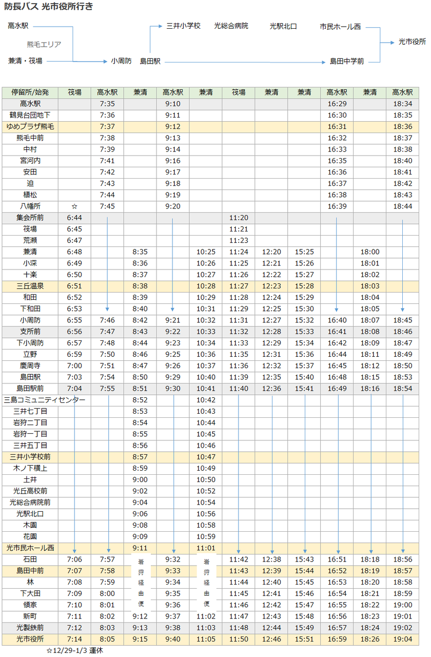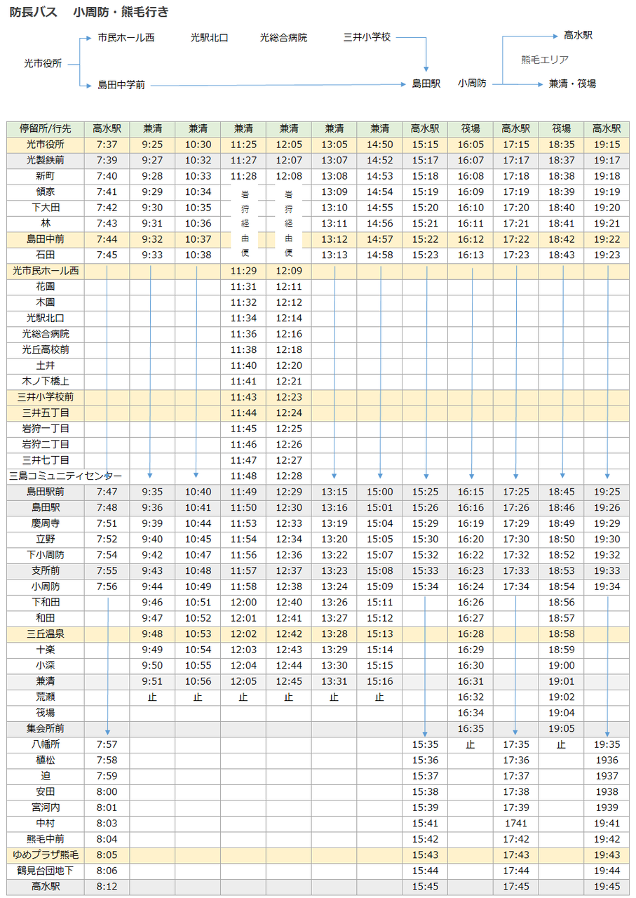 - 防長バス(光市役所⇔兼清・筏場・魚切)路線(路線B)は2017年10月の運行変更により、魚切(八代)へはコミュニティバスでの運行となりました。防長バスは高水駅止まりになっていますのでご注意下さい。(2018年1月)