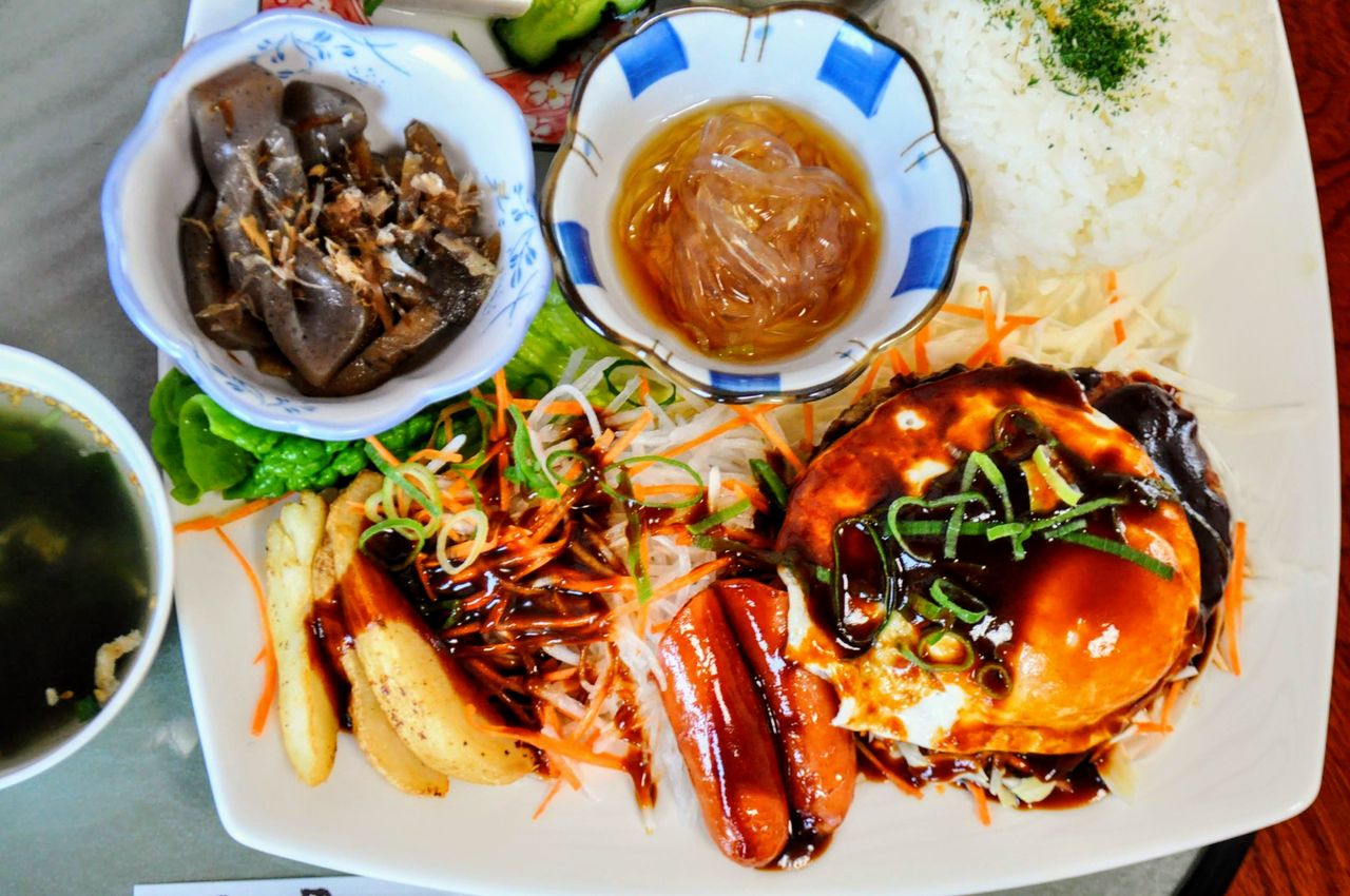 メニューは和洋共に出されていますが、冒頭にも触れましたが家庭の味と地域の食材が中心。そんな中で現在の所一番人気が”ロコモコ”(¥1,000)。ベースとなる"目玉焼き"onハンバーグ+ライスの他に季節物がワンプレートに乗る。