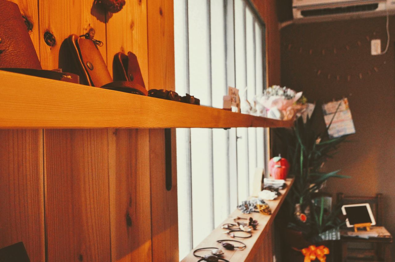 また、席の後ろにある棚スペースを使って地元の小物作家さんが持ち寄る小物等も棚スペースを活用し販売している。丁寧に作られた綺麗な小物が並んでいます。