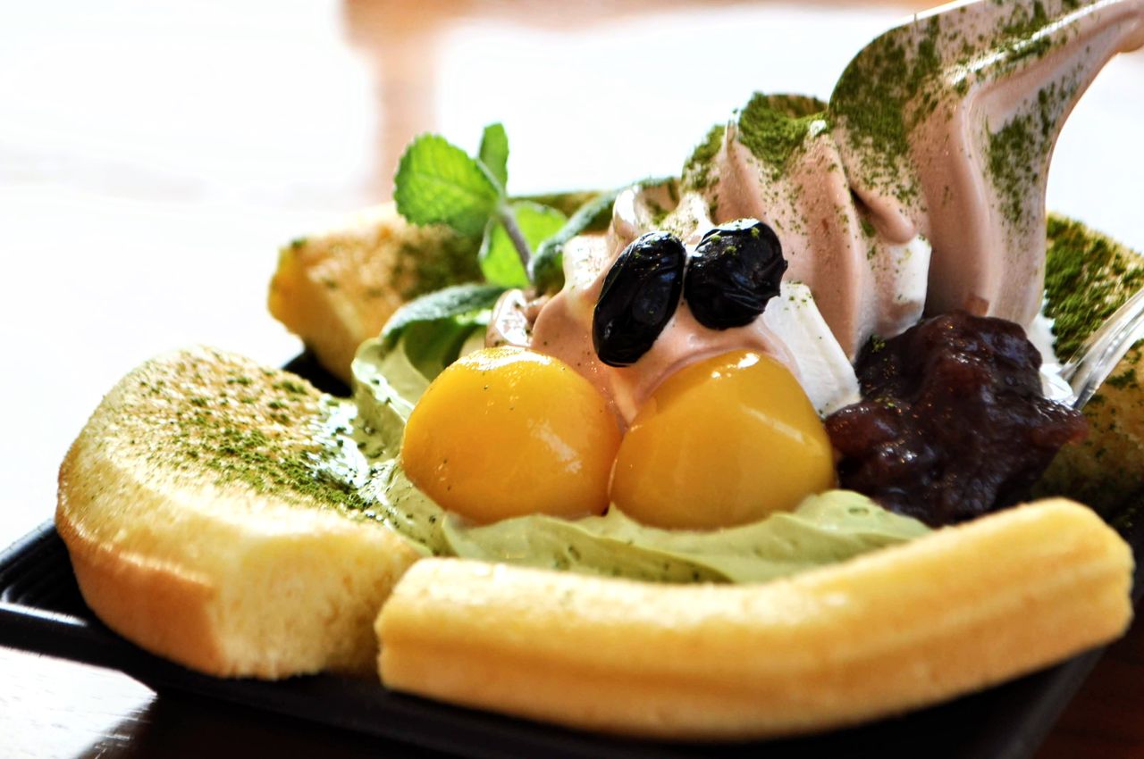 中の厨房で生地から作りだしたプレーンなパンケーキの上にソフトクリームをベースとした甘味。各フレーバーに合わせトッピングをマウントしたものになっている。