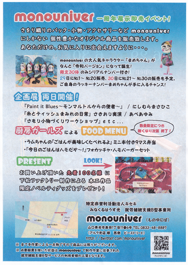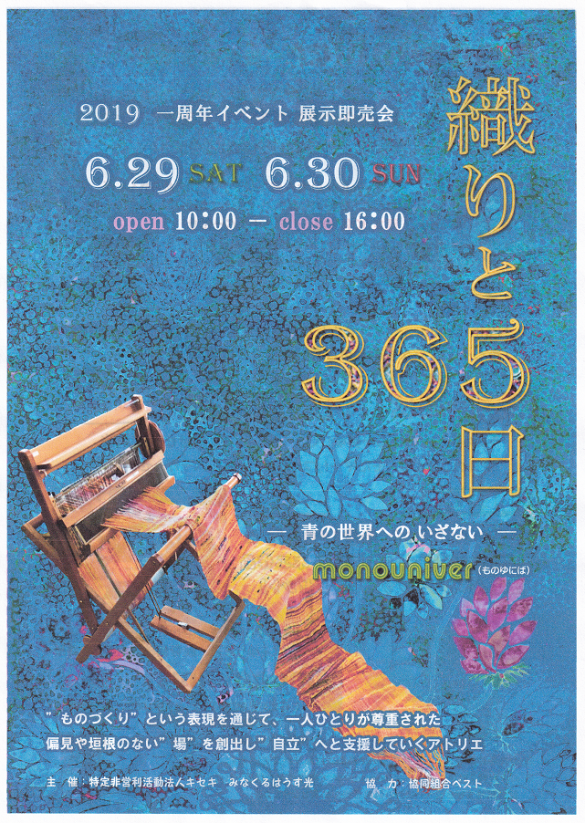 約1年前のこの時期に商業区であるBe.Stの一角からスタートし、すっかり地域に溶け込んで日々良い空気を注いでいる"ものゆにば"さんが展示即売イベントをされます。この1年、さをり織りを通じ様々な商品提案にチャレンジしてきた思いからこのタイトルが付けられたのだと思います。