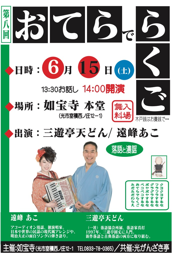 今回の「おてらでらくご」で公演されるお二人は遠峰あこさんと三遊亭天どんさん。光がんざき亭さんによると"どんあこ"という愛称で全国を回られているそうです。今月6月は萩から始まる県内回り強化月間のようですよ。