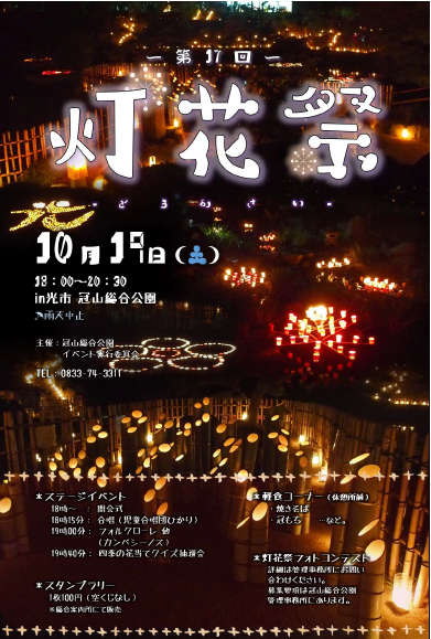 夜が随分と肌寒くなるころに"灯花祭"は開催されますが、冠山総合公園一面に広がる燈火は美しさと共に温かさを感じる灯篭の祭典です。今年の開催で19回目となる見込みで、多くの方が幻想的な灯りの中で写真撮影や夜散歩を楽しんでられます。また児童合唱団ひかりやフォルクローレが出演するステージイベントも行われます。