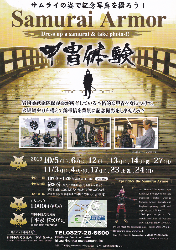 岩国錦帯橋の東岸そばにある「本家松がね」さんで甲冑体験が開催されていますので以下お伝え致します。この甲冑は岩国藩鉄砲隊保存会が所有している甲冑を「本家松がね」で着け周辺で写真撮影が出来るイベント。この体験イベントは各指定された日に開催され10月は27日、11月は各週末に開催されるようです。