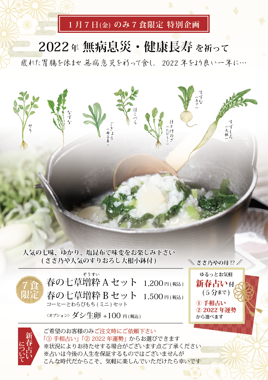 この企画と並行して七草粥セット(持ち帰りセット)は、5日で予約締切となっているようです。来年も同企画がありましたら事前にご案内致します。