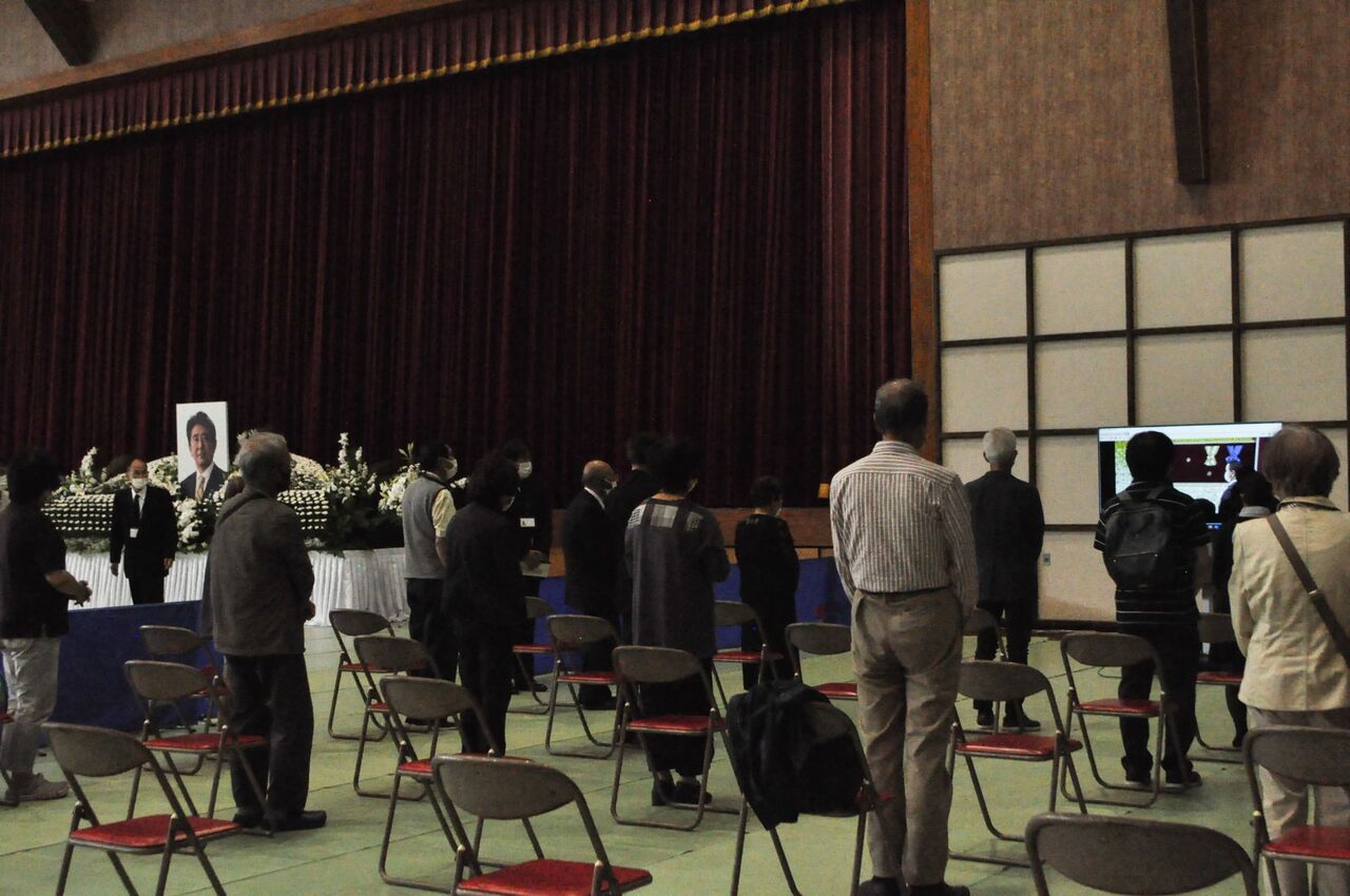 バタフライアリーナに設けられた献花会場では厳重な警戒の中、ご家族や友人等と共に献花に訪れる方が多く見受けられました。この地域が故安倍晋三氏の実弟である岸信夫氏の地元であるため後援会の方や親交があった方などが来場し故人を偲びつつ思い出などを語ってられました。
