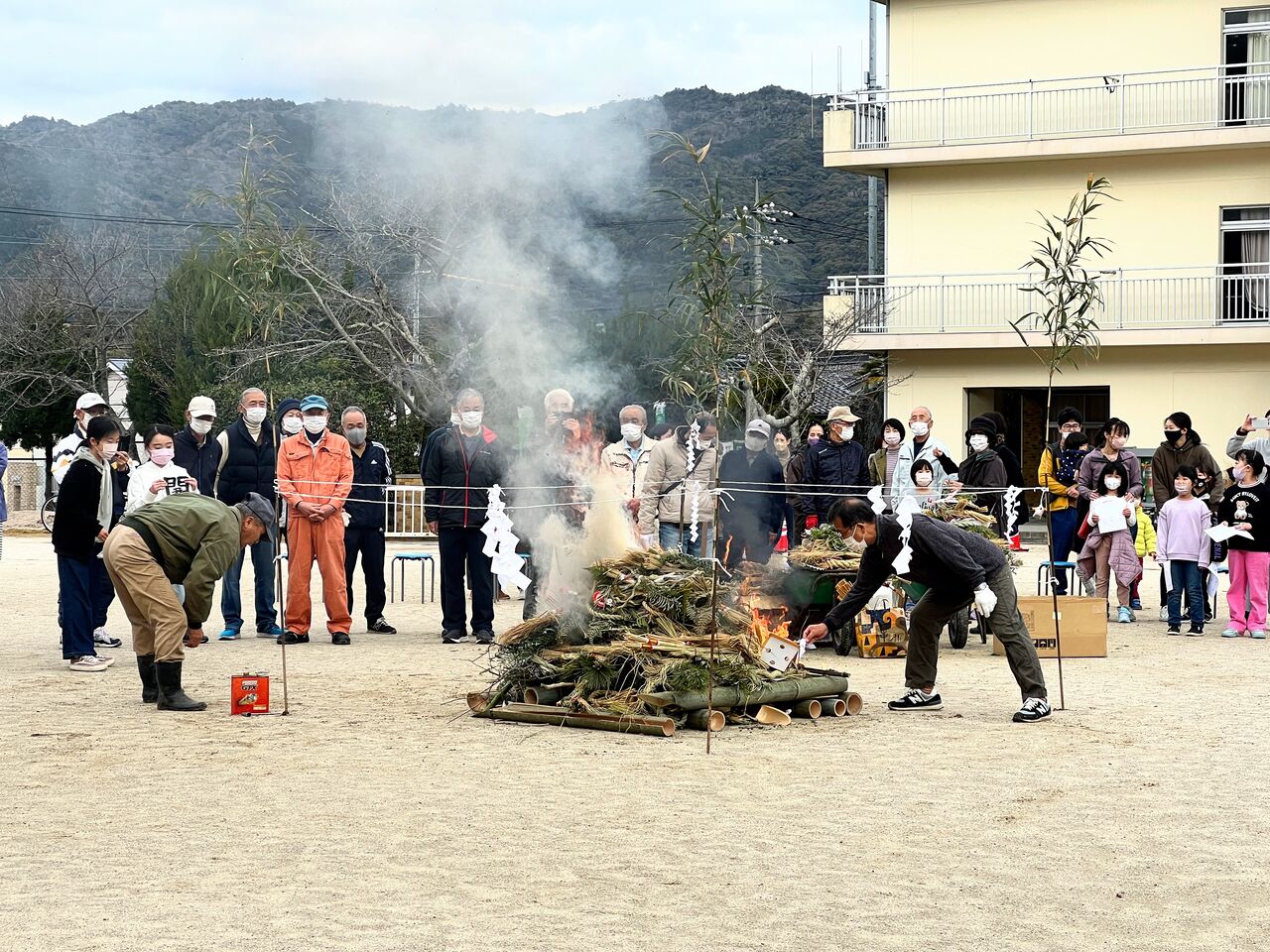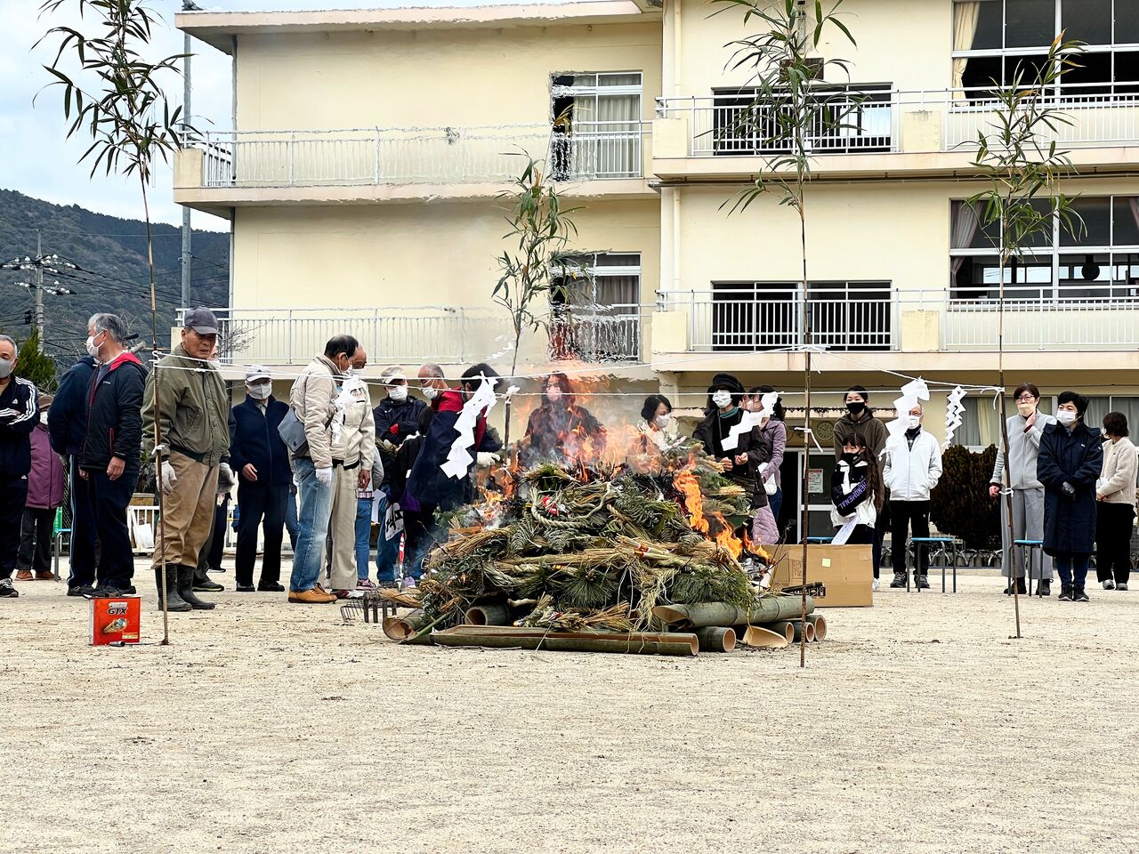 旧暦で言うところの小正月(1月15日)に上島田小学校のグラウンドでどのど焼きが開催され、正月飾りや書初めをもった方が約70人ほど集まっていました。