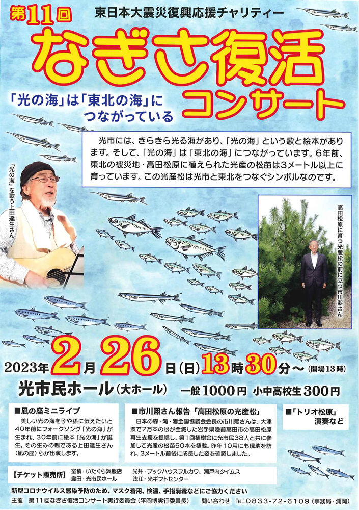 昨年(令和4年度)のコンサートは中止となりましたが、3年振りとなる「なぎさ復活コンサート」が開催されます。震災後の2013年から数え11回を迎えるチャリティコンサートは、渚・松の繋がりから津波でながされた浜の復活を祈念したものです。(当日映像、全編1時間51分49秒)