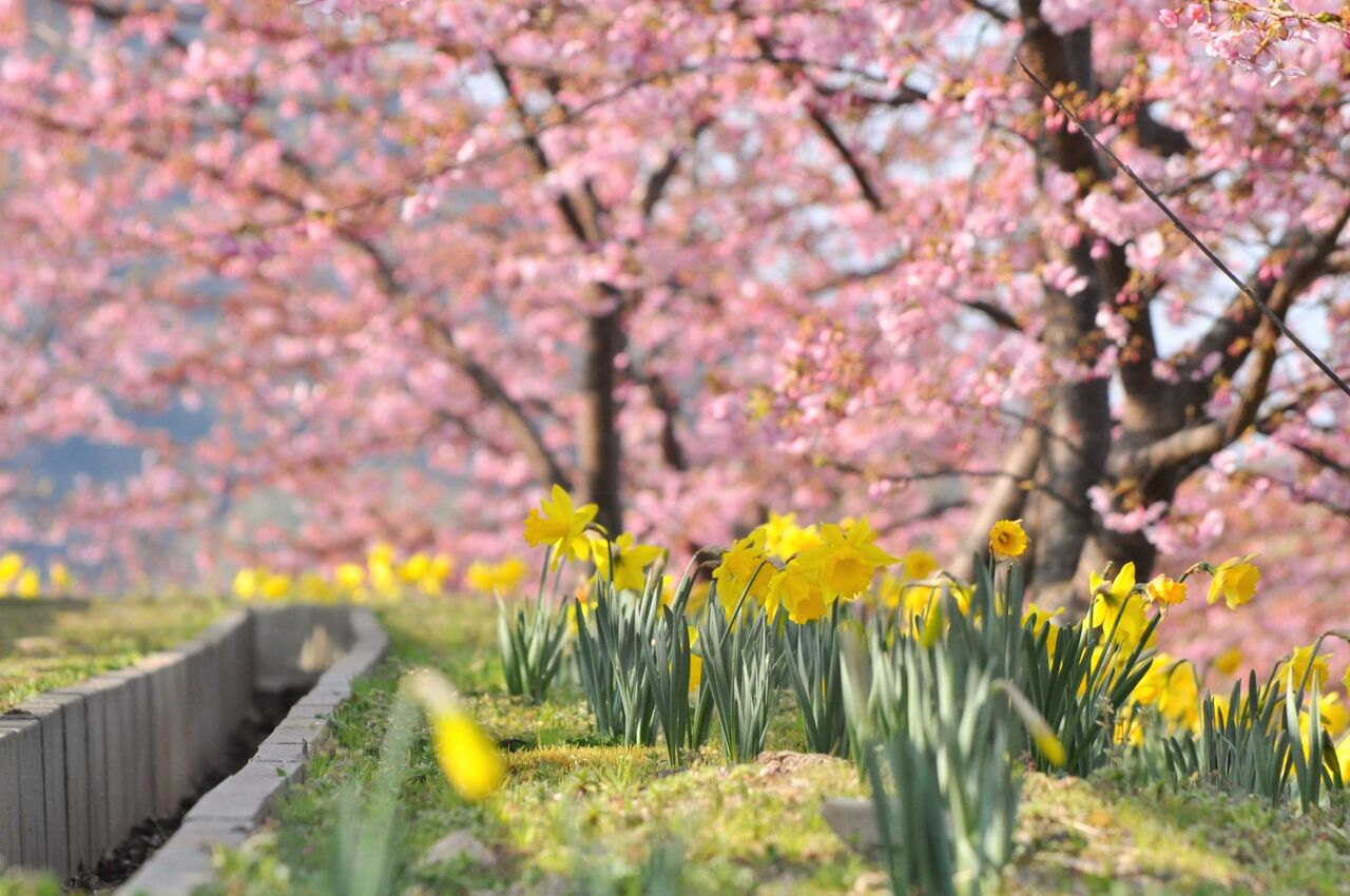 この時期、海と空の青、桜のピンク、スイセンの黄色が見事な上関では、2月23日から「桜まつり」として開始された河津さくら。しかし、河津さくらの見頃はもう少し先のようです。2月23日現時点での開花状況は、まだ一分咲きの様子。