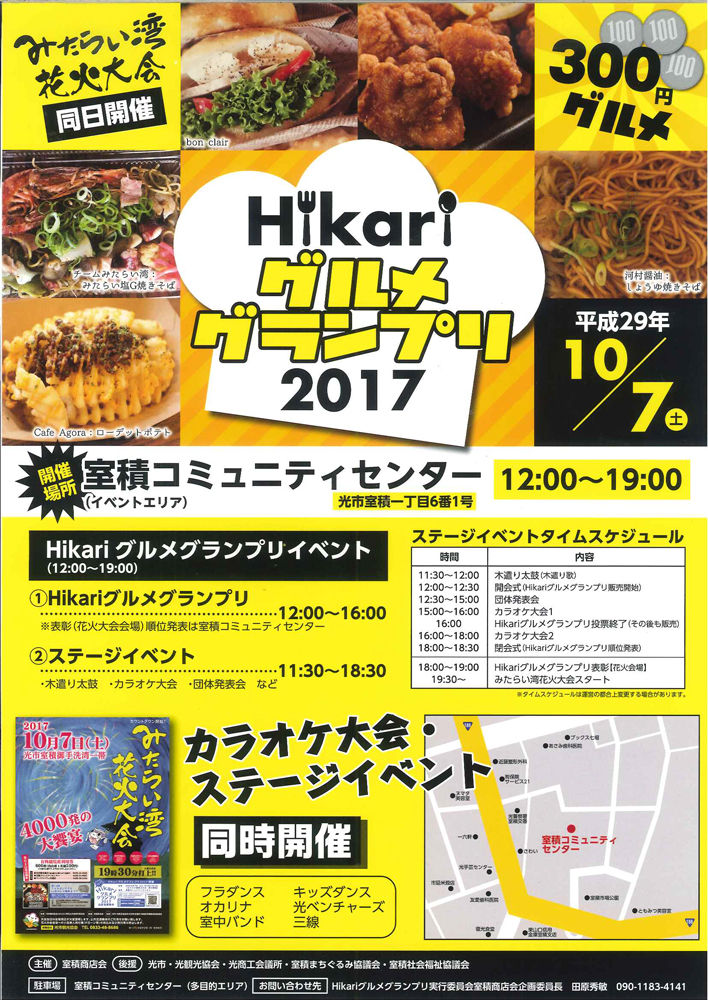 2017年10月07日 Hikariグルメグランプリ2017 10月7日(土)開催 同日夜19:30からは、みたらい湾花火大会 カテゴリ:イベント室積地区 チラシ出典 : 光市観光協会ウェブサイトより Hikariグルメグランプリ実行委員会室積商店会この時期、室積が騒がしい!w1品¥300で食べれる ○○グルメw 元々評価の高いお店や有志等が参戦。(チラシより推測w)みたらい湾花火大会前の楽しみに。当日は、駐車場の確保等、混雑が予想されますので、案内等をご覧頂きご注意下さい。・ Hikari グルメグランプリ2017 ・10月7日(土)12:00-19:00・開催場所 室積コミュニティセンター(光市室積1-6-1) ・1品¥300 公式Facebookページ 主催:室積商店会 後援:光市 光観光協会 光商工会議所 室積まちぐるみ協議会 室積社会福祉協議会 グルメグランプリ開催場所(地図) タグ :#室積地区#グルメグランプリ#みたらい湾花火大会 「イベント」カテゴリの最新記事 このお酒 侮れません! 純米無濾過原酒「中島屋」秋上がりHikariグルメグランプリ カラノ みたらい湾花火大会