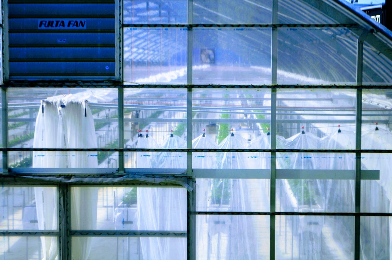 ハウスを外から少し見ただけだがセンサー機器や自動化された装置が見える。