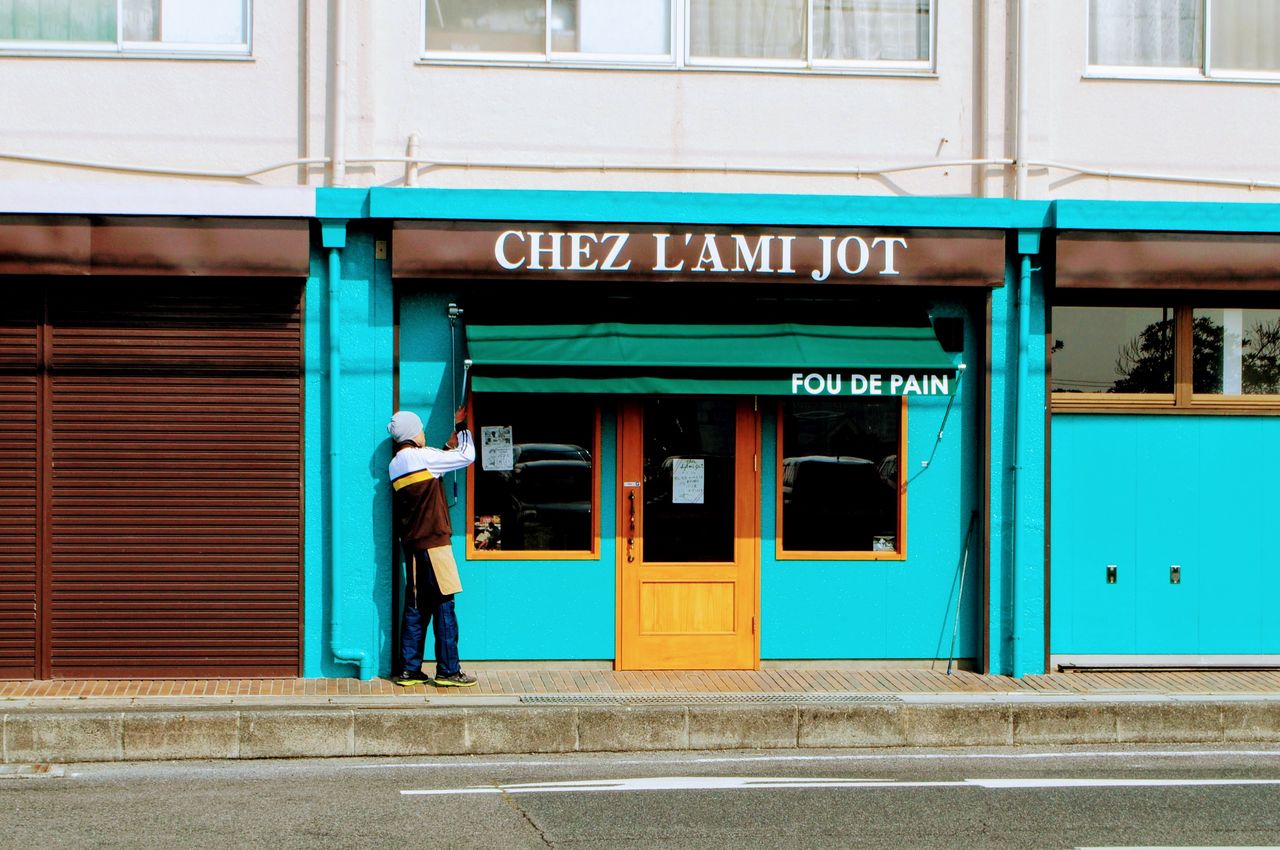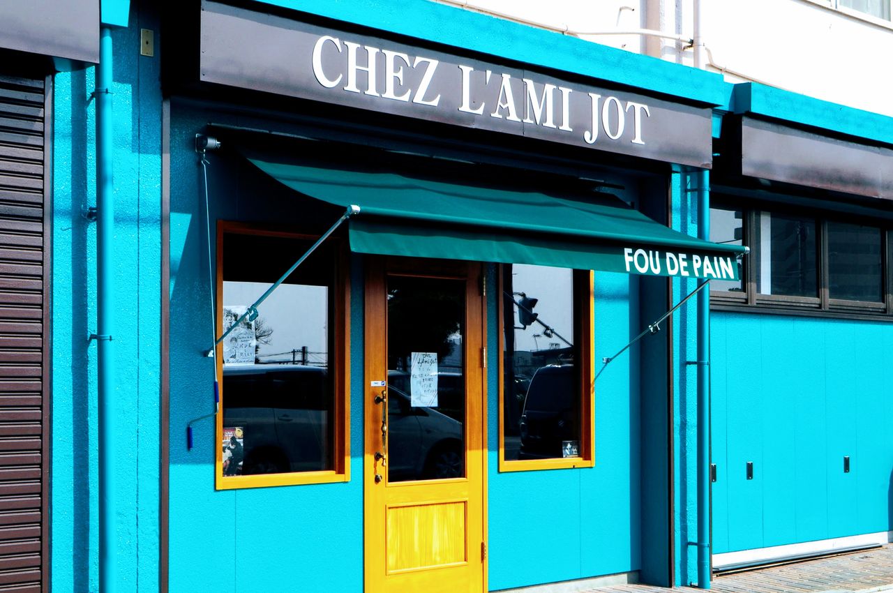 お店の名前がまた少し洒落ていて "chez l'ami jot"(シェ ラミジョ)。「友へ~」の意味になります。また、暖簾(シェードスクリーン)に掲げられた文言 "fou de pain" とは直訳すると「クレージーパン」w 西洋ではクレージー(英)的な用語を「熱を込めた」と言う意味になり、例えば”crazy for you等”は耳にされたことが有ると思いますが。。(マドンナの楽曲のフレーズ。古!)このように、お店を訪問すると入口から「あっ」となる仕掛けと言うかコダワリの部分が随所にあります。