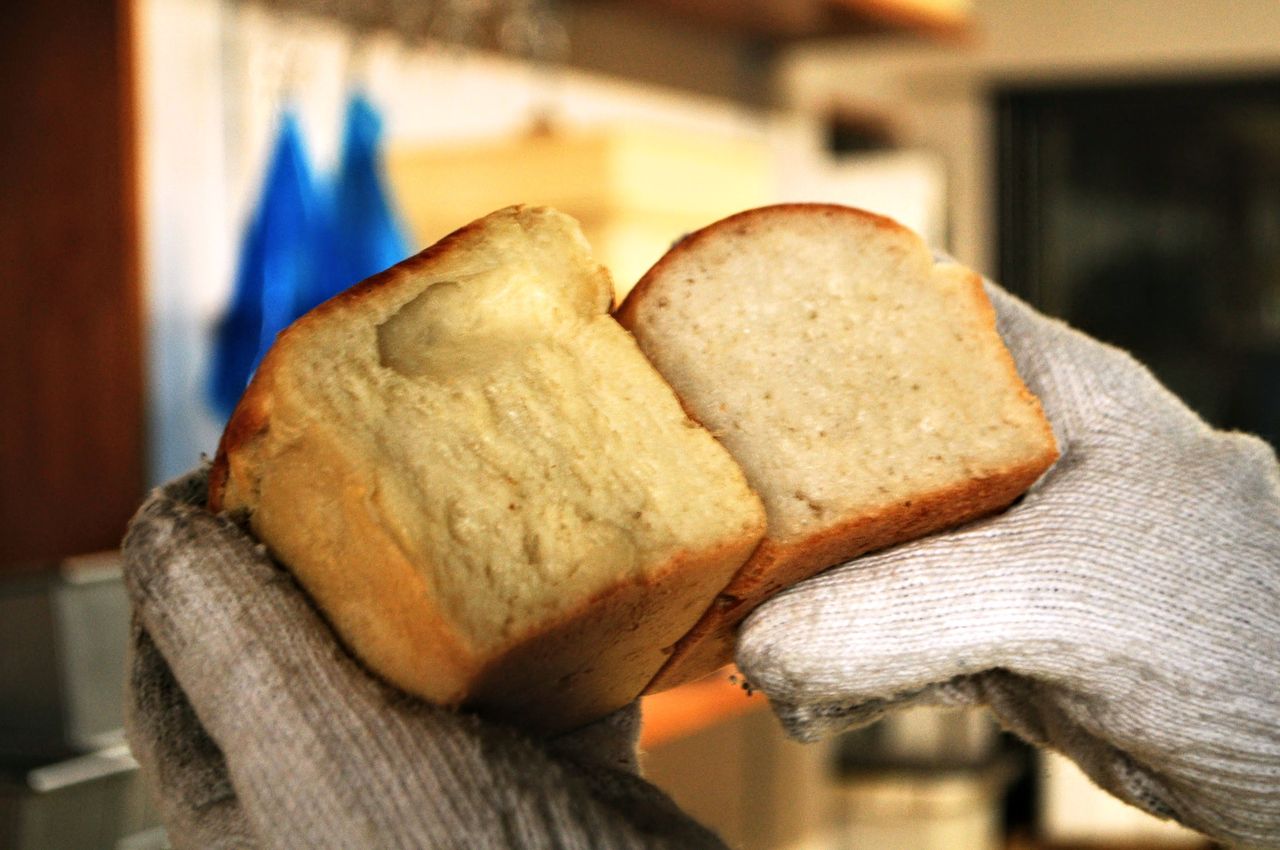 訪問時が、少しづつ配合を変え幾つかテストし味を決めている過程だったようで、テストで作られたパンを試食させて頂きました。プレーンな食パンですが、ほのかに小麦の「薫り」と甘さを感じ、しっとりとした柔らかさを感じるとても美味しいパンに仕上がっていました。