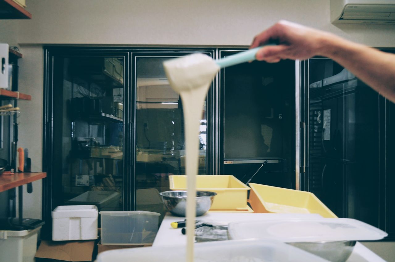 お店の基礎となる顔(生地)には、乳製品(牛乳・バター)・卵を使わず天然の酵母の力だけで小麦そのものを引き出す製法を採用しています。フランスでは "levain liquide"(levain=酵母)「液体酵母」と言うようです。上の画像の通り、伸びやかな少し粘りのある生地の素になっています。