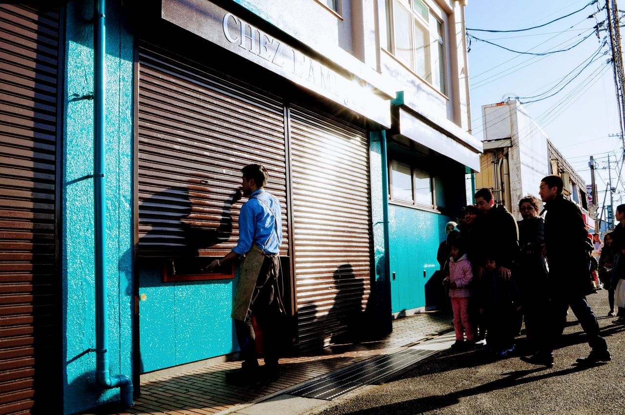 (期待と願いを込めて開店のシャッターを開ける店主トシさん)