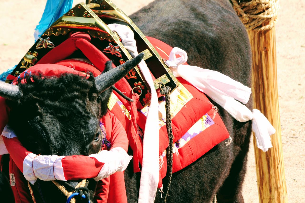 祭りは、毎年4月の第1日曜日と決まっており、社殿から御旅所までの参道を金襴緞子(きんらんどんす)を纏った寄進牛が御網代輿(あじろごし)を引いてねり歩きます。