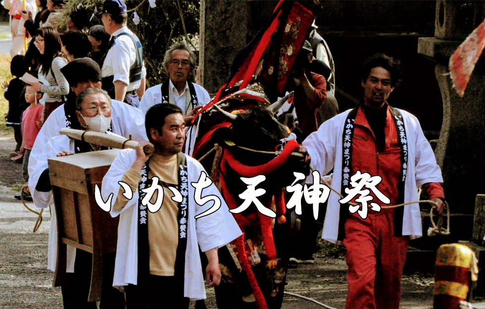 この「いかち天神祭」(通称:牛天神)は、古くは170年以上も前より五穀豊穣を祈念し菅原道真を奉る氷室亀山神社で祭祀を執り行うようになった神事のようです。
