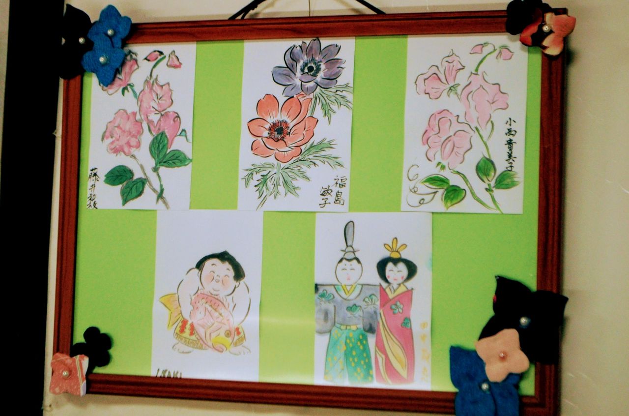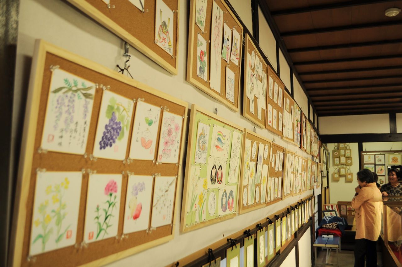 ご自宅や室積コミュニティセンター、富士白苑での教室で共に制作された作品が並んでいます。